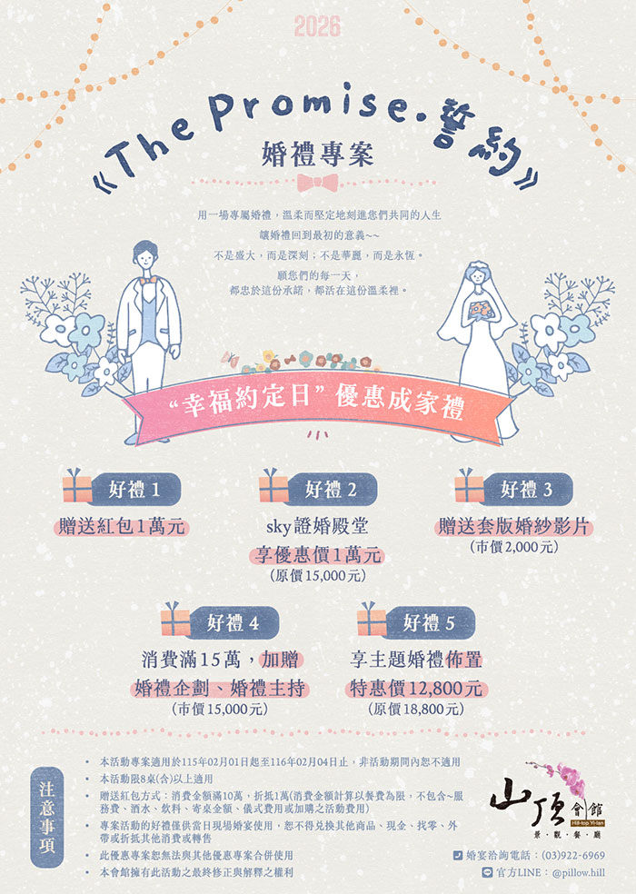- 好禮4:消費滿15萬,加贈婚禮企劃、婚禮主持(市價15,000元)