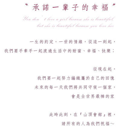 山頂會館景觀餐廳以最祝福的心,給您最幸福、最浪漫又溫馨的婚宴,讓您留下最美麗的一刻。