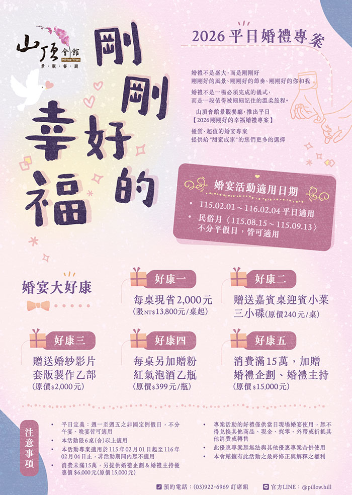 山頂會館景觀餐廳,推出平日“2026剛剛好的幸福婚禮專案”